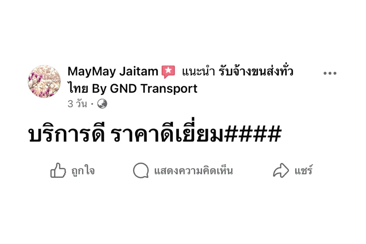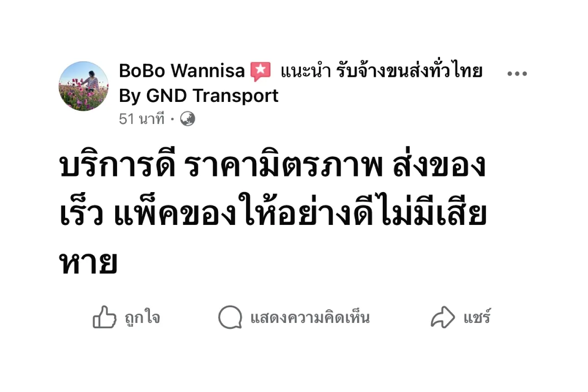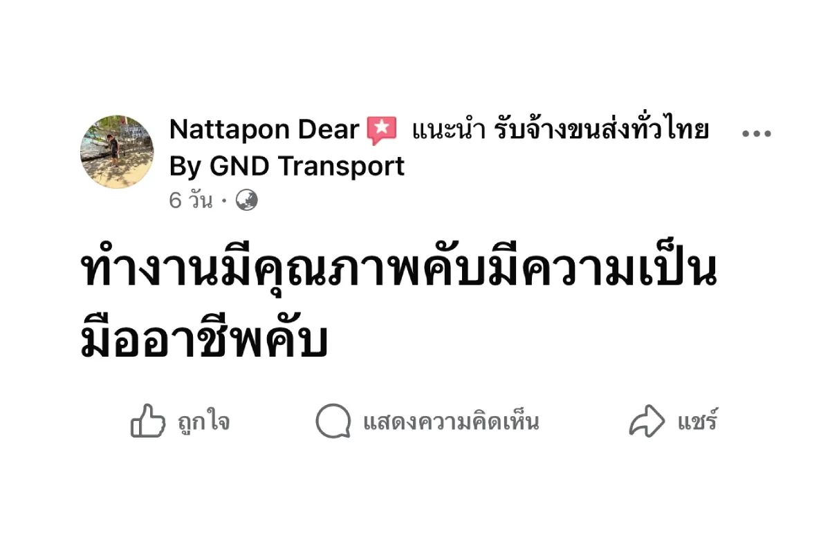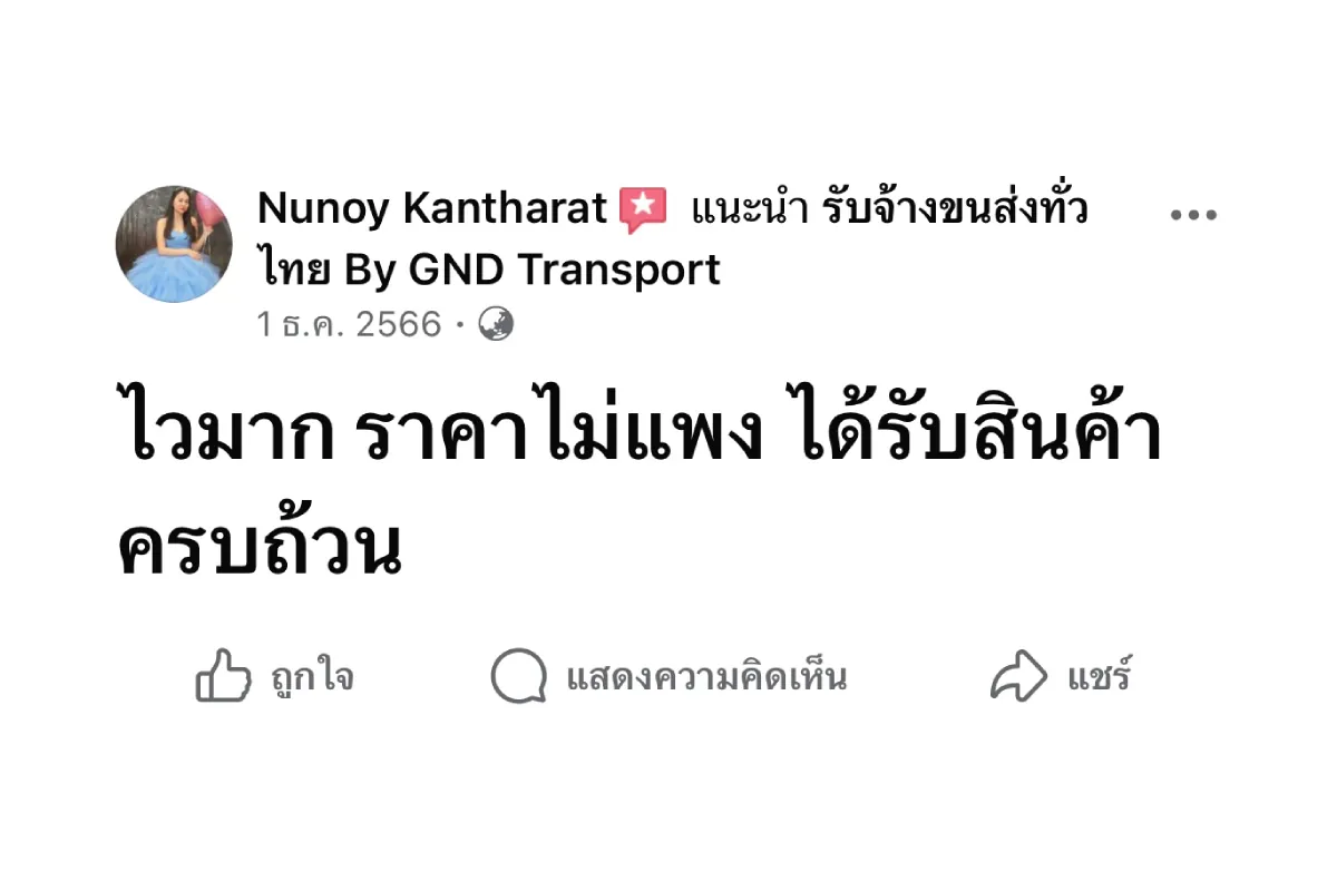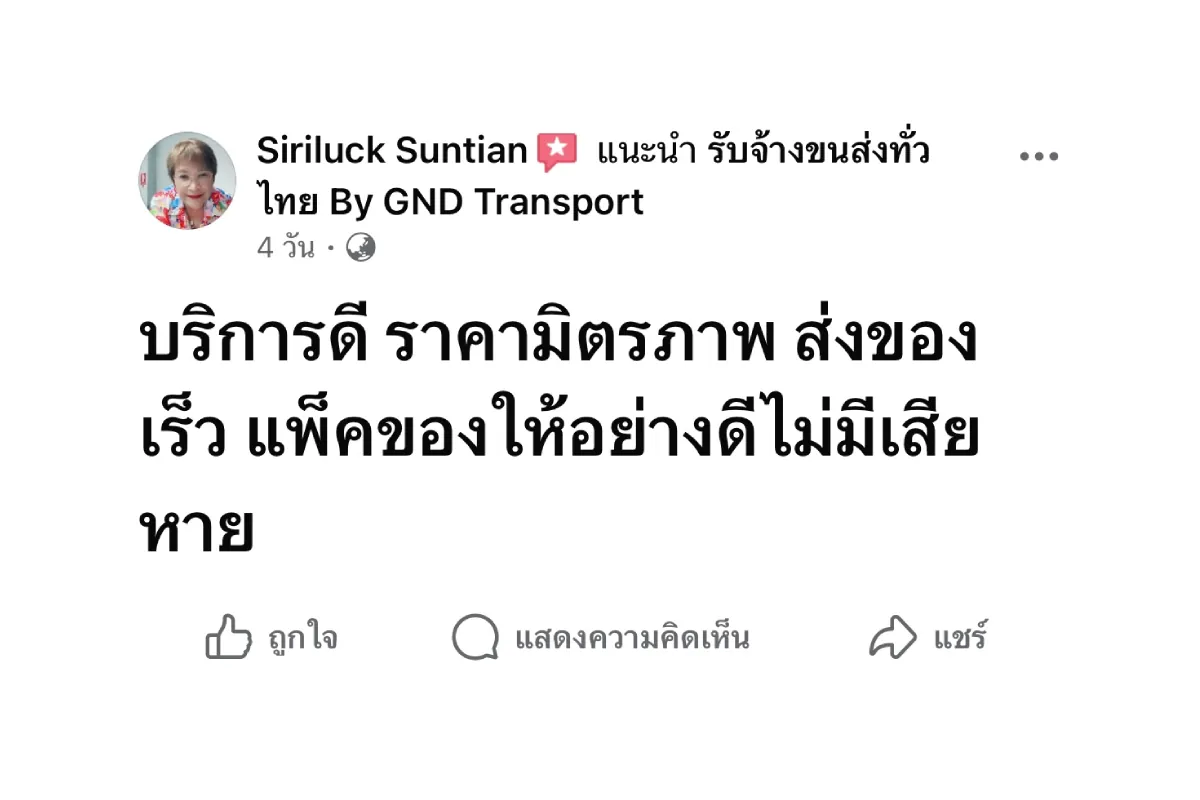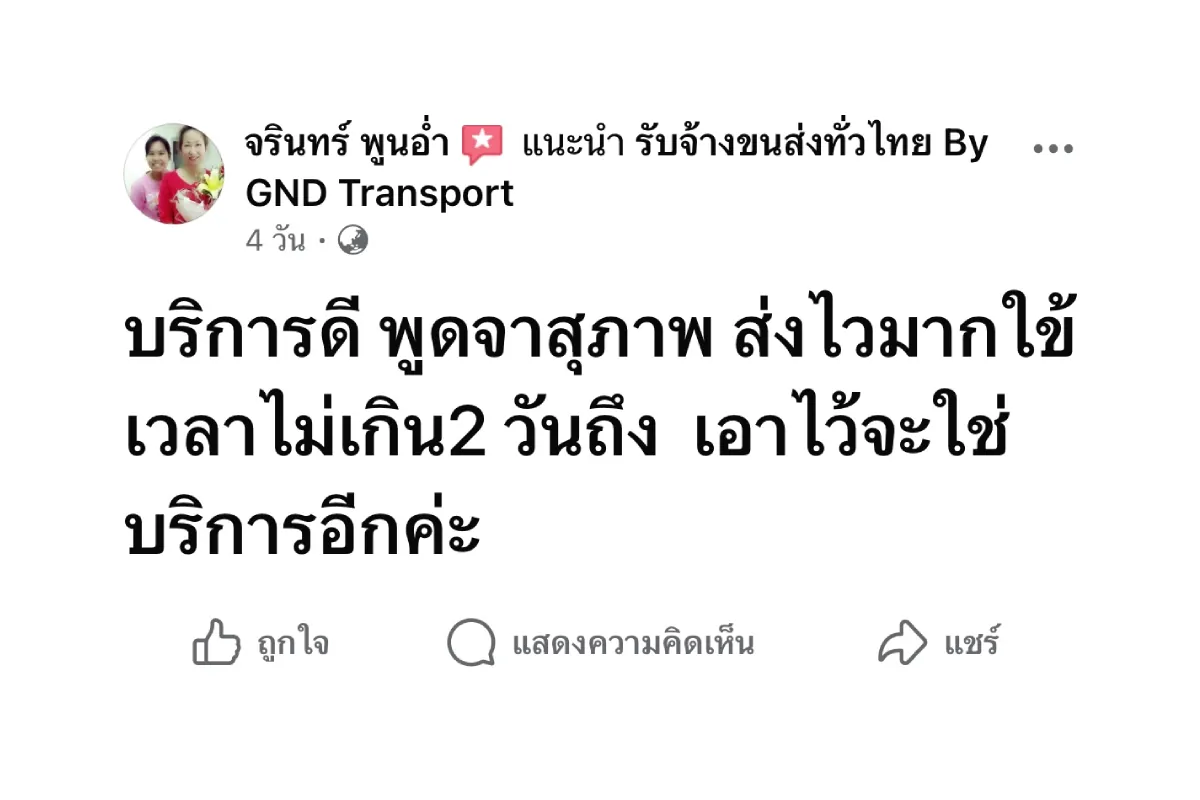 การันตีด้วยผลงานจริง เรารวบรวมตัวอย่างงานขนส่งที่เคยให้บริการ ทั้งการย้ายบ้าน ย้ายสำนักงาน และการขนส่งสินค้า ที่ลูกค้าไว้วางใจเลือกใช้เรา รีวิวจากลูกค้า ทุกคำรีวิวสะท้อนถึงความใส่ใจและคุณภาพการบริการจริง จากลูกค้าที่เคยใช้บริการขนส่งกับเรา สอบถามบริการ โดยทีมงานมืออาชีพ!